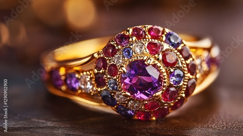 A close-up of a colorful gemstone ring with vibrant amethysts, rubies, and sapphires set in gold