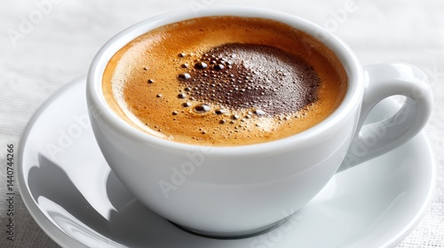 a close-up of a cup of hot espresso with crema on a white isolated background, bold and flavorful design