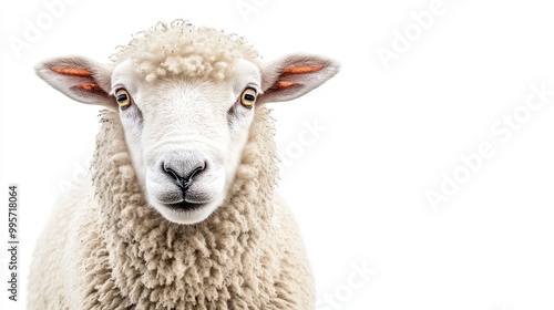 A Close-Up of a Curious Sheep Looking Directly at the Camera Against a White Background