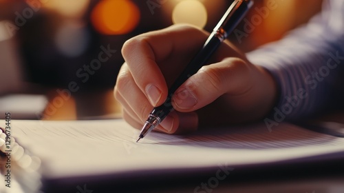 A close-up of a customer service agent writing notes during a call, with a smile in their voice