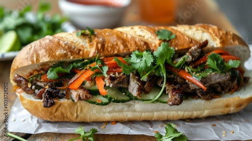 A close-up of a delicious-looking Vietnamese sandwich with grilled meat, cucumbers, and cilantro.