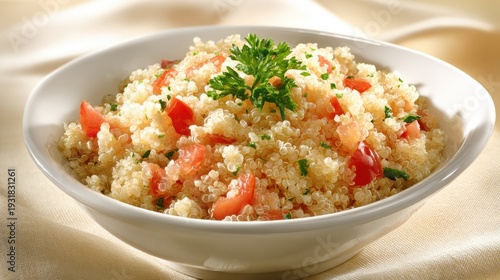 A close-up of a fluffy bowl of quinoa with chopped tomatoes and fresh parsley garnish, perfect for healthy eating.
