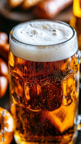 a closeup of a frothy beer in a glass stein placed on a wooden table surrounded by traditional German sausages pretzels mustard and Oktoberfest decorations captured in vibrant colors