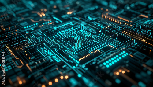 A close-up of a futuristic circuit board with glowing lines and components, evoking high-tech and digital precision