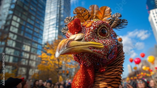 turkey, parade, sculpture, glittering, rhinestone, red, gold, city, building, crowd, closeup, feather, beak, eye, decorative, festive, holiday, celebration, urban, bright, sparkly, art, colourful, event, street, background, autumn, fall, day, outdoors, photo, image, visual, detail, texture
