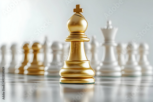 A close-up of a golden chess piece standing out among white pieces, symbolizing strategy and competition in the game of chess.