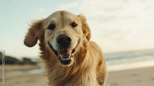 A close-up of a golden retriever dog running on a beach
