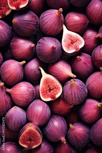 fruit, fig, purple, red, fresh, ripe, halved, pattern, group, closeup, food, texture, background, healthy, organic, natural, sweet, juicy, delicious, summer, autumn, harvest, dessert, snack, vegetarian, vegan, still life, photo, macro, detail, vibrant, colourful, dark, moody, minimal, simple, smooth, glossy, soft, round, skin, seed, stem, leaf, plant, nature, produce, market, garden