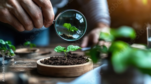 plant, growth, magnifying, glasses, nurture, sustainability, vitality, calmness, harmony, greenery, cognition, exploration, discovery, wellness, atmosphere, root, science, photo, biology, gardening, sharpened, earth, essence, ecosystem, sunlight, potential, dirtied, life, horticulture, observation, care, pot, cultivation, light, freshness, healthy, botany, macro, texture, detail, leaf, beauty, flora, verdant, green, nature, environment, landscape, organic