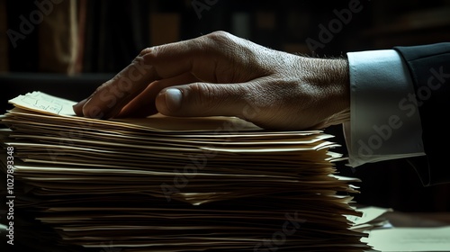A close-up of a hand resting on a stack of files, symbolizing organization and the weight of responsibilities in a professional setting.