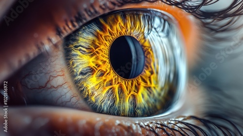 A close-up of a human eye, with a vibrant golden iris that seems to pulsate with life. The intricate detail of the eye is mesmerizing.