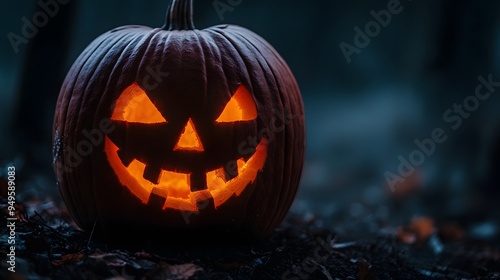 A close-up of a jack-o-lantern with a scary face glowing in the dark