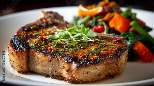 A close-up of a juicy, grilled pork chop with a beautifully seared crust, served with a side of sauted vegetables and a sprinkle of fresh herbs.
