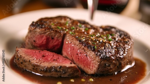 A close-up of a juicy steak on a plate, sliced to show the tender pink center, accompanied by a rich peppercorn sauce and a glass of red wine.