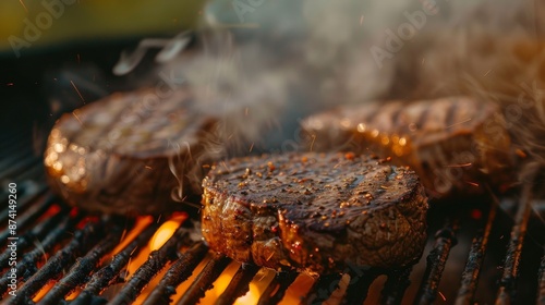 A close-up of a juicy tenderloin steak sizzling on a hot grill, with grill marks and smoke rising.
