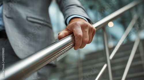 hand, man, grey, suit, professional, railing, stainless, steel, business, indoor, modern, architecture, grip, male, adult, businessman, elegant, formal, style, fashion, office, workplace, urban, contemporary, design, detail, texture, metal, support, hold, gesture, close, sharpened, background, blurred, interior, environment, corporate, lifestyle, success, career, professionalism, photogenic, appearance, attire, elegance, confidence, strength