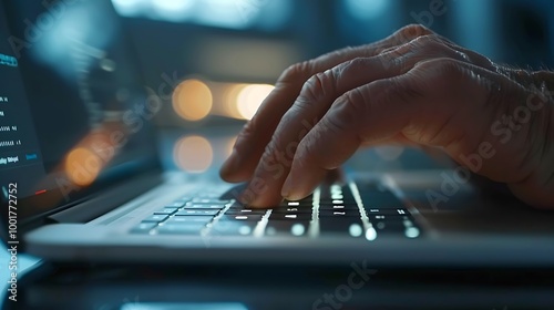 A close-up of a man's hand using a laptop to hack or steal data, set in a modern office environment. The scene captures the seriousness of the data theft with a focus on the intensity