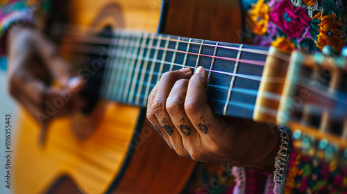 A close-up of a mariachi musician's hands strumming a guitar, with the vibrant strings in focus