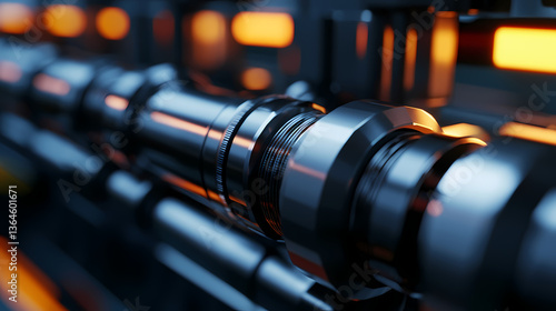 A close-up of a metallic industrial component, showcasing intricate details and a futuristic look with vibrant lighting.