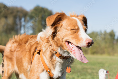 A close-up of a Nova Scotia Duck Tolling Retriever with its eyes closed and tongue out, expressing pure joy and contentment outdoors on a sunny day.