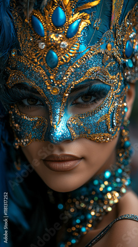 A close-up of a person in a colorful carnival mask, capturing the mystery and beauty of the celebration during the parade.