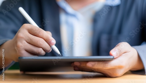 A close-up of a person using a stylus on a tablet, highlighting technology in modern business practices.