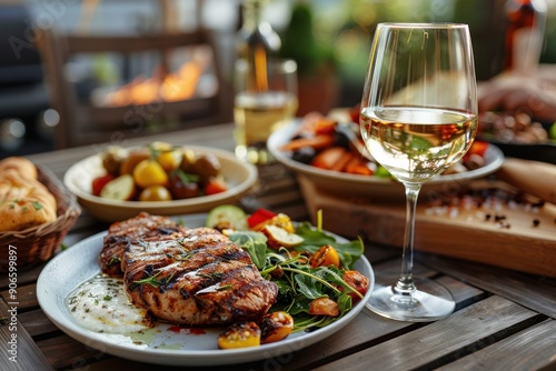 A close-up of a plate filled with grilled meat and roasted vegetables, accompanied by a glass of white wine on a wooden outdoor table, creating a cozy dining atmosphere.