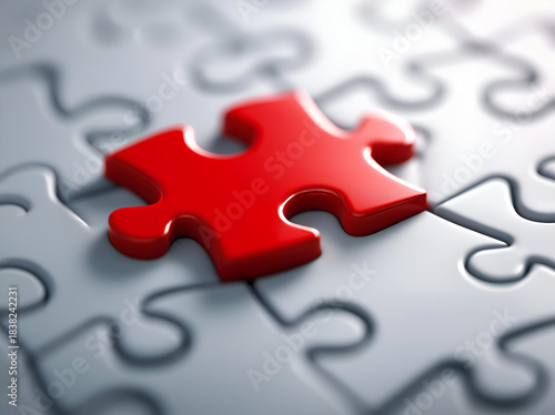 A close-up of a red puzzle piece sitting amidst a collection of unfinished pieces, symbolizing problem-solving and creativity.
