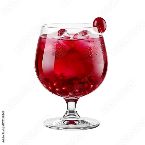 A closeup of a red wine glass isolated on a white background captures the liquid beverage during a celebration as the sweet alcohol is poured into a snifter for a party