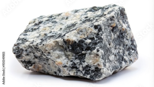 A close-up of a richly textured, grey granite rock with subtle flecks of silver and black, isolated on a pure white background for contrast.