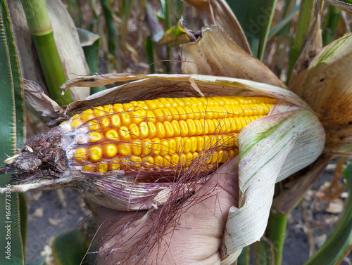 A close-up of a ripe ear of corn held in a hand directly on the stalk. The image symbolizes the bounty of the harvest and the rewarding results of agricultural labor.