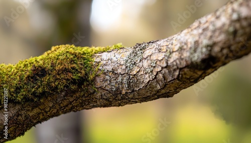 A close-up of a rough tree limb, covered in moss and bark textures, blending naturally with the soft earthy tones of the forest around it.