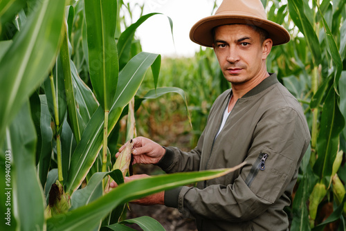 corn, farmer, agriculture, field, male, man, hat, jacket, crop, farming, rural, outdoors, summer, growth, harvest, food, plant, green, nature, natural, organic, healthy, person, occupation, lifestyle, work, thoughtful, caucasian, adult, professional, agronomy, maize, serious, portrait
