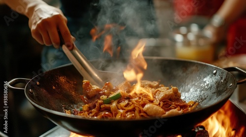 A close-up of a Singaporean cook skillfully stir-frying a fragrant plate of Char Kway Teow in a sizzling hot wok.
