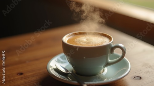 cup of coffee, closeup, steaming, wooden table, crema, warmth, comfort, cosy, emotion, art, beauty, beverage