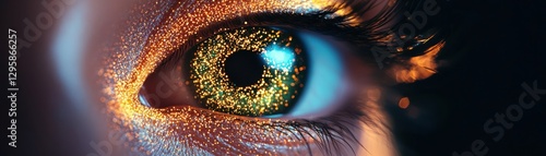 A close-up of a striking eye with vibrant green and gold colors, enhanced with glitter, set against a dark background.