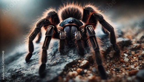 A close-up of a tarantula on a rocky surface, highlighting its hairy legs and intense gaze.