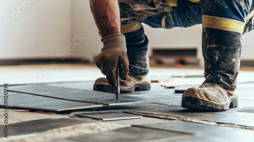 closeup, tiler, work, clothes, knee, pad, holding, tile, floor, background, laying, scene, skilled, meticulous, style, photo, precision, attention, detail, high, quality, image, tool, technique, used, tiling