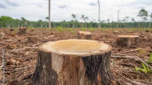 A close-up of a tree stump in a deforested area, highlighting the impact of logging on the landscape and environment.