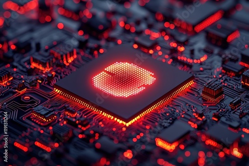 A close-up of a vibrant red CPU on a dark circuit board, showcasing intricate electronic components and modern technology.