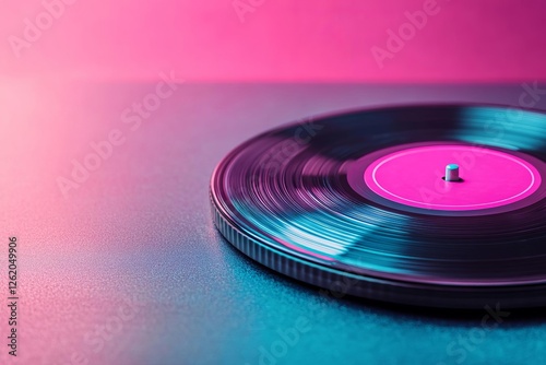 A close-up of a vinyl record on a colorful surface, evoking nostalgia and music vibes.