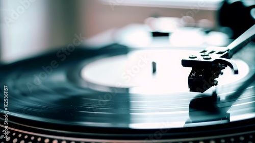 A close-up of a vinyl record spinning on a turntable, showcasing the needle in motion.