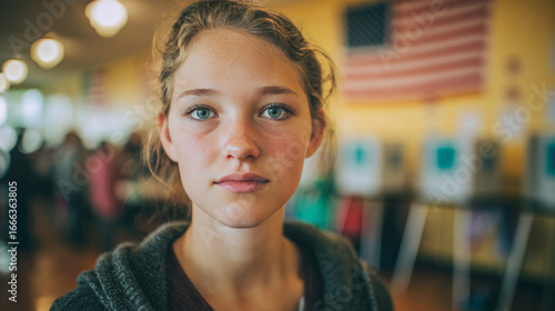 face, closeup, camera, polling station, blurred background, american flag, expression, determination, engagement, democracy, election, participation, civic duty, right, responsibility, anticipation, hope, diversity, inclusion, ballot, decision, choice, voice, empowerment, awareness, community, enthusiasm, activism, identity, citizenship, representation, influence, trust, value, future, leadership, oneness, pride, integrity, advocacy, motivation, change, commitment, involvement