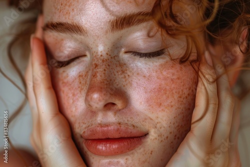 A close-up of a woman gently touching her face as she wakes up, her eyes still half-closed. Her expression is calm and serene, capturing the natural beauty of waking up. This image highlights the