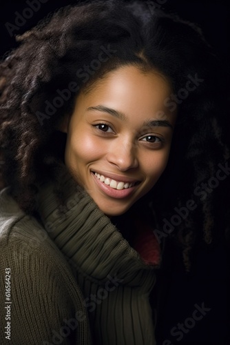 human face, person, smile, clothing, portrait, lip, eyebrow, woman, ringlet, lady, black hair, makeover, lipstick, dark, indoor, girl, illustration, generative, ai