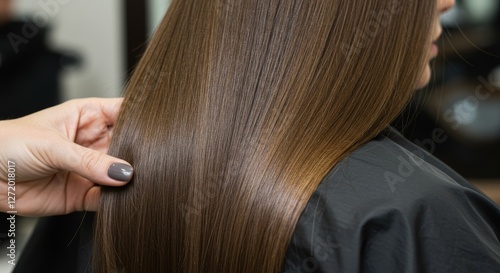 A close-up of a woman’s smooth, perfectly straightened hair after a keratin treatment. The silky strands reflect soft lighting, emphasizing the sleek, polished look