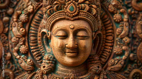 A close-up of a wooden statue of a deity, possibly a representation of Buddha, with intricate carvings and a serene expression.