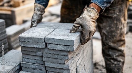 A close-up of a worker stacking concrete blocks, showing the raw materials and precision involved in modern building.