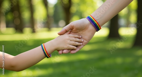 A close-up of an adult and child holding hands in a park, both wearing colorful rainbow bracelets, symbolizing love, unity, and diversity in a serene green environment.