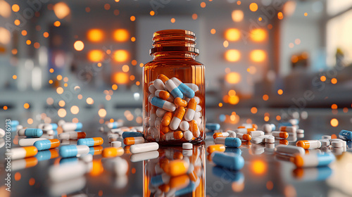 A close-up of an amber glass bottle filled with pills, surrounded by scattered capsules and tablets in orange, blue, and white, on a reflective surface.